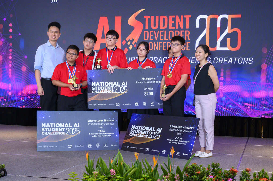 The Infocomm Club celebrates success at the National AI Student Challenge 2025, with participants and teachers displaying their championship titles across multiple categories