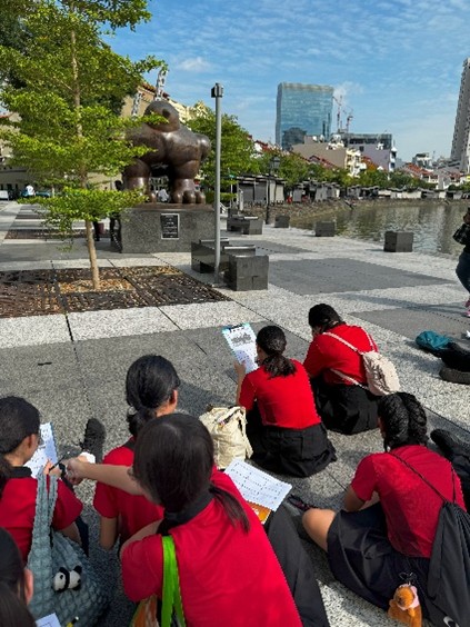 Students sketching the iconic Botero Bird along the Singapore River, blending history, heritage, and art into a meaningful learning experience.