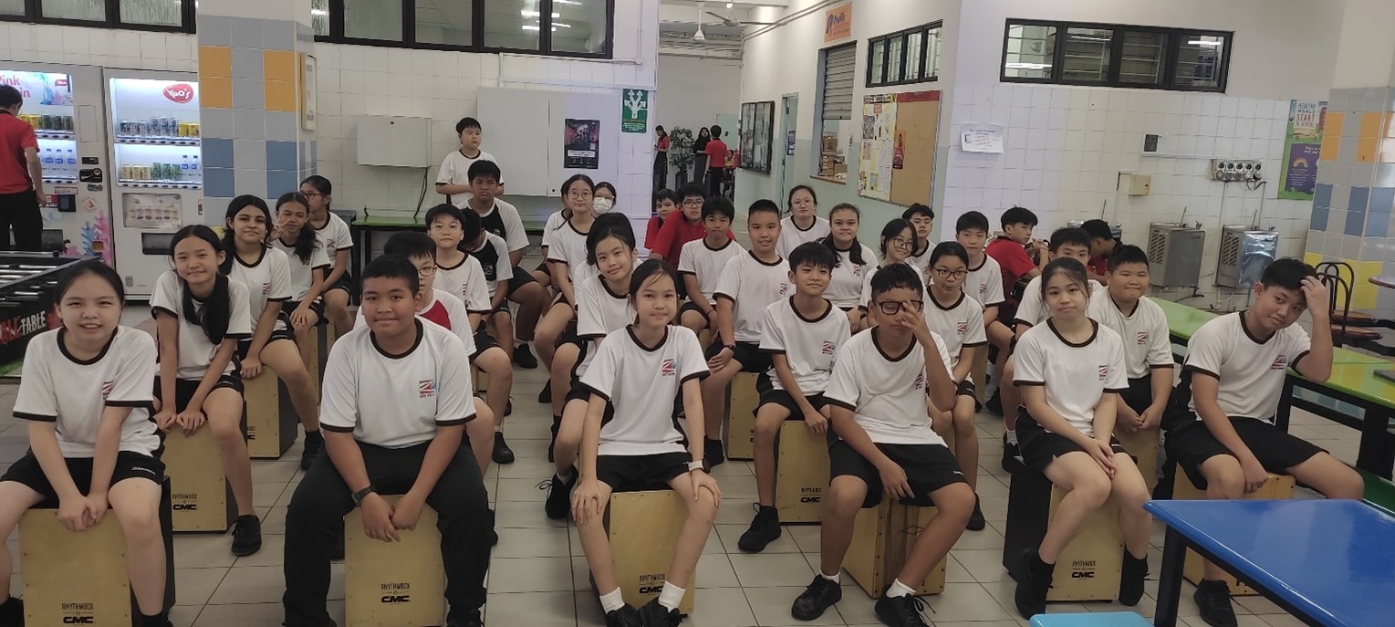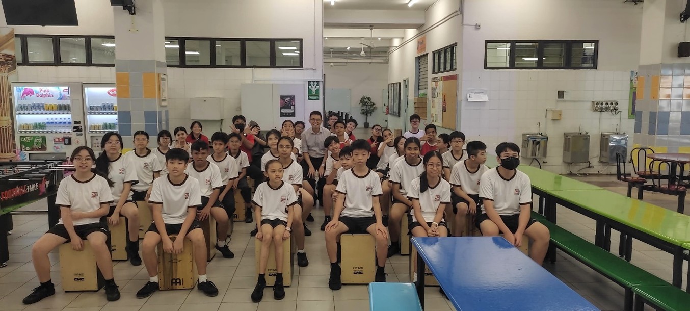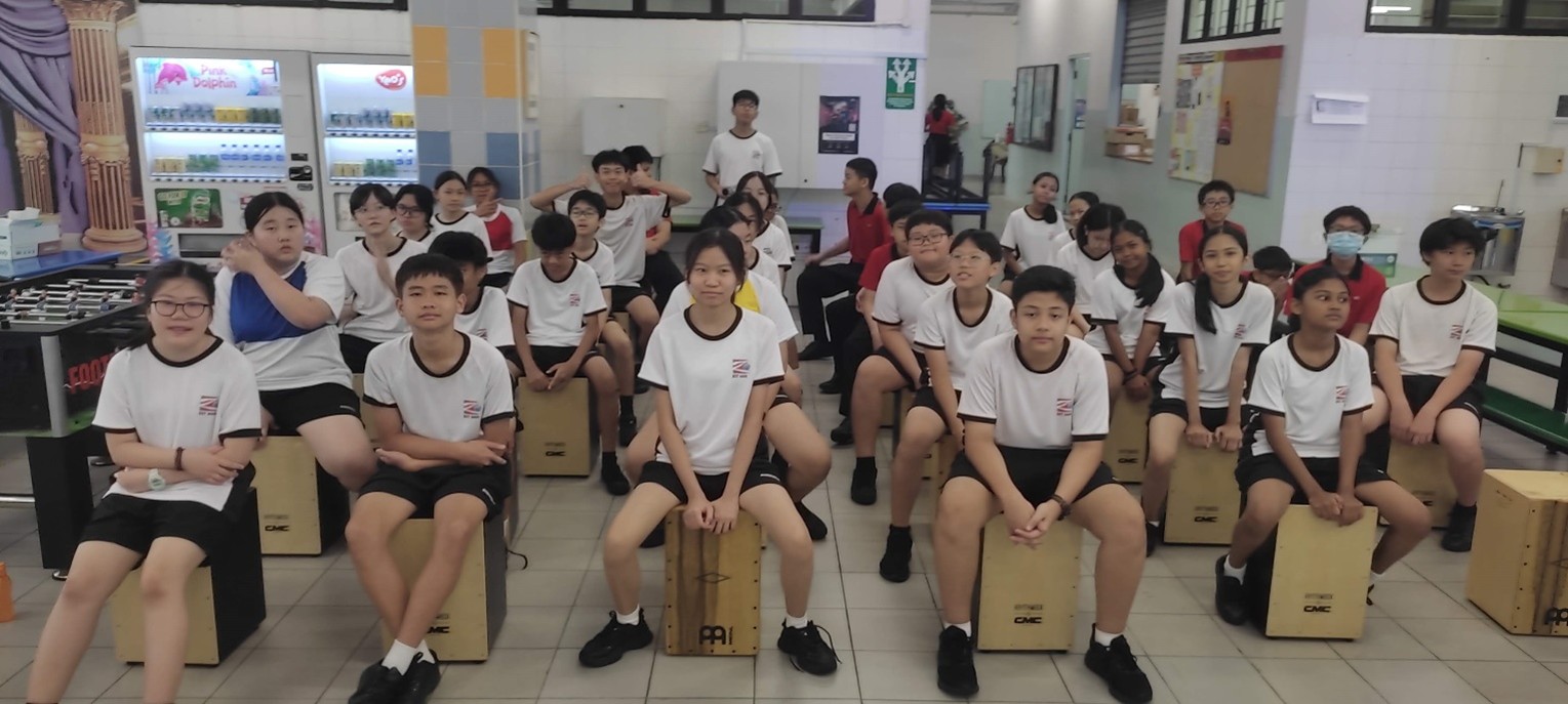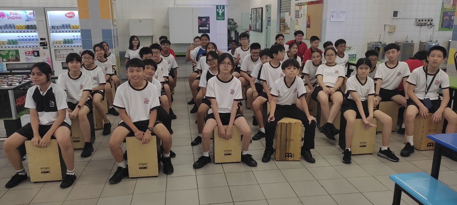 Sec 1 students showcasing their cajón skills during break-time performances in the canteen.
