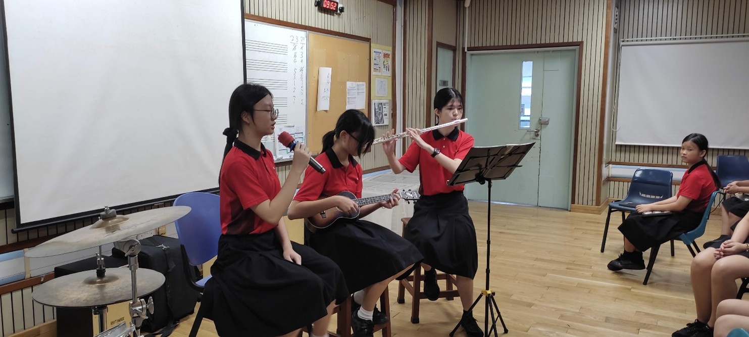 At the lower secondary level, Sec 1 students learn cajón and guitar, performing as ensembles and sharing their music with peers through platforms such as canteen screenings and break-time showcases. Sec 2 students advance their skills on the ukulele, applying techniques such as tab reading and plucking in band performances. They also engage in songwriting, combining lyrics, chords, and melodies to create original works.
